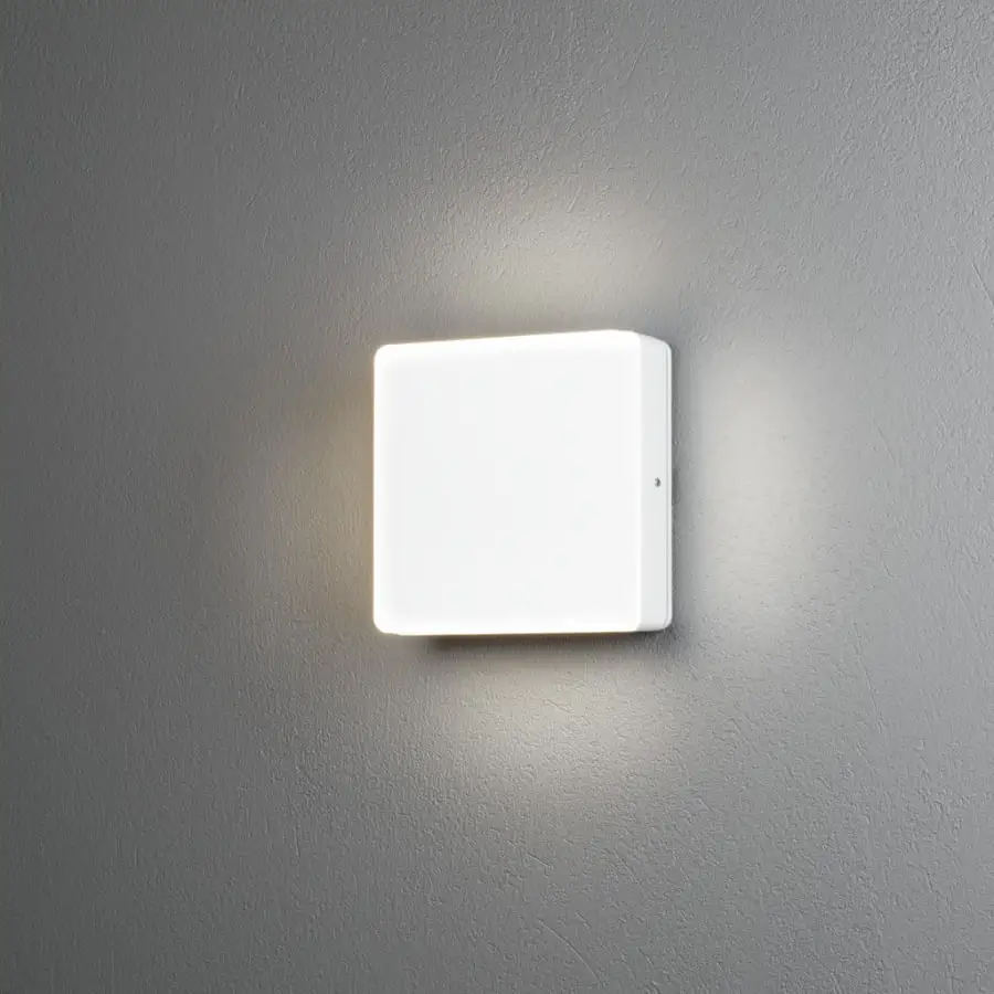 Konstsmide Cesena 7863-252 tak-/utomhusvägglampa, IP54, längd 6,5 cm, bredd 16 cm, höjd 16 cm, opal polykarbonat, kropp aluminium, kroppsfärg vit, 600lm, fast LED 1x10W, 3000K, dimmer, kan kedjas, kan ytan -installera