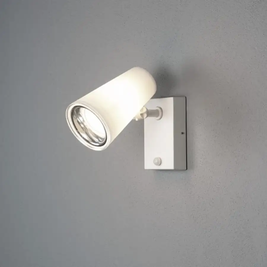 Konstsmide Fano 7873-250 vägglampa utomhus, IP54, längd 21 cm, bredd 18 cm, höjd 12 cm, opal akryl, aluminiumstomme, kroppsfärg vit, glödlampa E27 max 1x25W ingår ej, glödlampa max höjd 125 mm, rörelsedetektor, burk vara kedjad, ytmontering möjlig