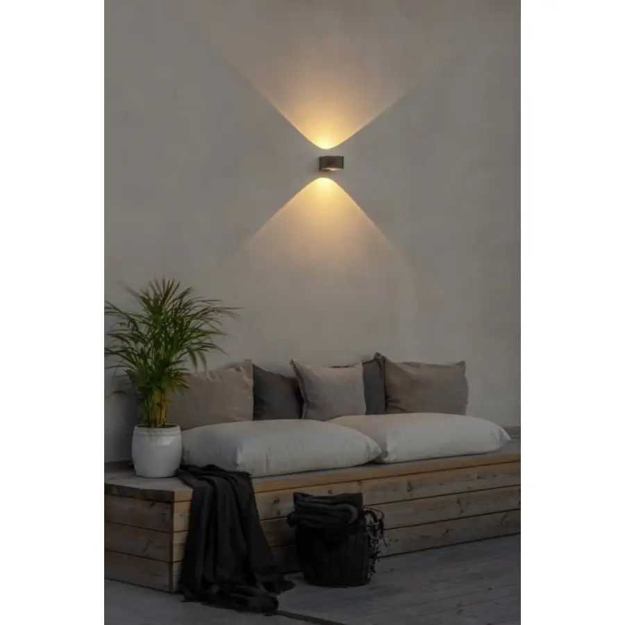 Konstsmide Gela 7882-370 vägglampa utomhus, IP54, längd 15,5 cm, bredd 11 cm, höjd 6,5 cm, linsformigt böjt klart glas, ram aluminium, ramfärg mörkgrå, 980lm, fast LED 2x6W, 3000K, upp-ned ljus, burk kedja, push-in- kopplingsdosa
