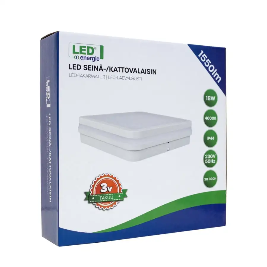 IP44 vägg-/taklampa med fast LED-modul för inom-/utomhusbruk. Applikationer, t.ex. garage, väggar av hus och lager. Vid inomhusbruk omfattar användningsområden t.ex. Toaletter, badrum och korridorer. 1550LM 18W 4000K, vit, fyrkantig.