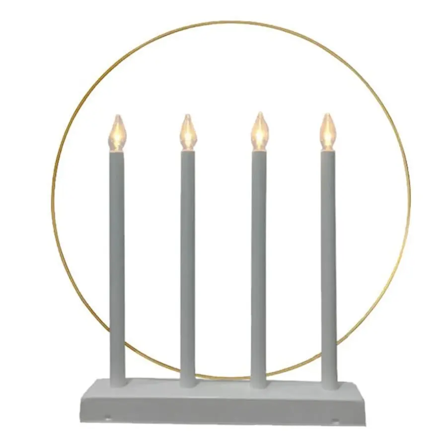 Beautiful white 4-branch led candlestick with warm and pleasant white light. A beautiful golden ring in the candlestick. The candle has a white 180cm power cord with a switch.