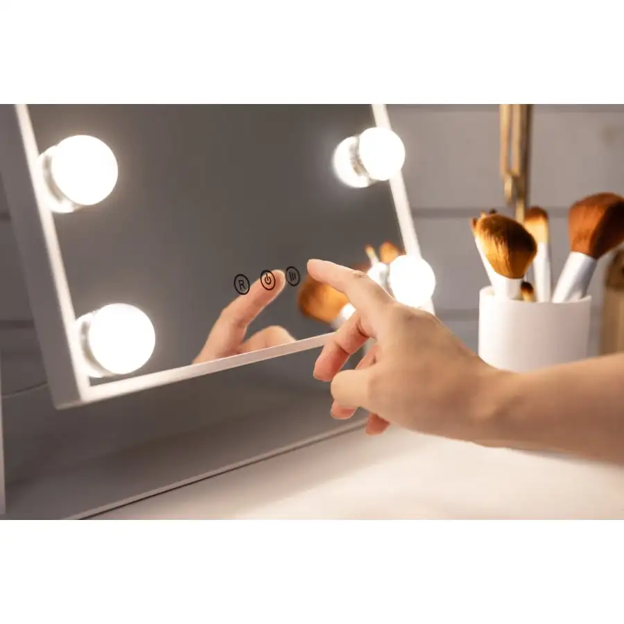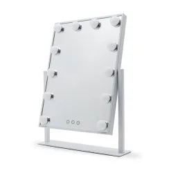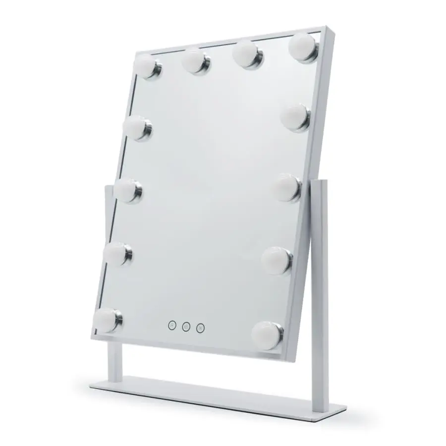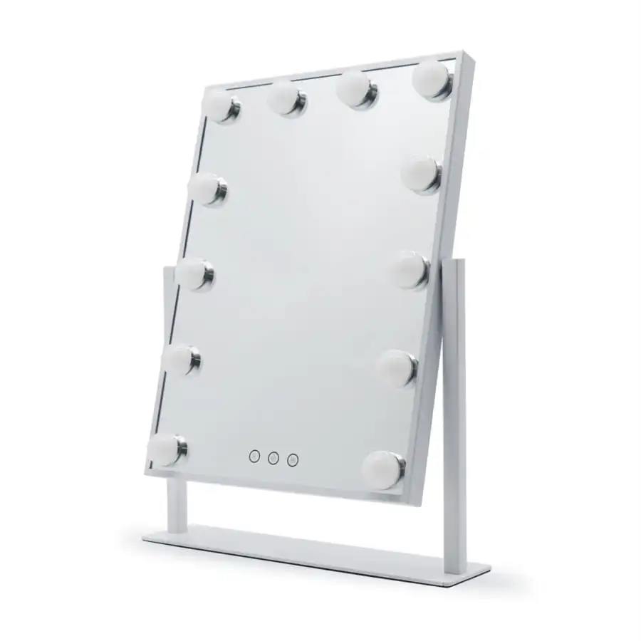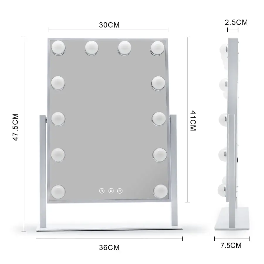 Stylish metal-framed Hollywood make-up mirror with 12 led lights. Light temperature and brightness from the touch button on the adjustable mirror. Adjustable temperature and brightness allow the right light for any situation. You can tilt the mirror to the desired angle. Coating at the bottom of the mirror better in place.
