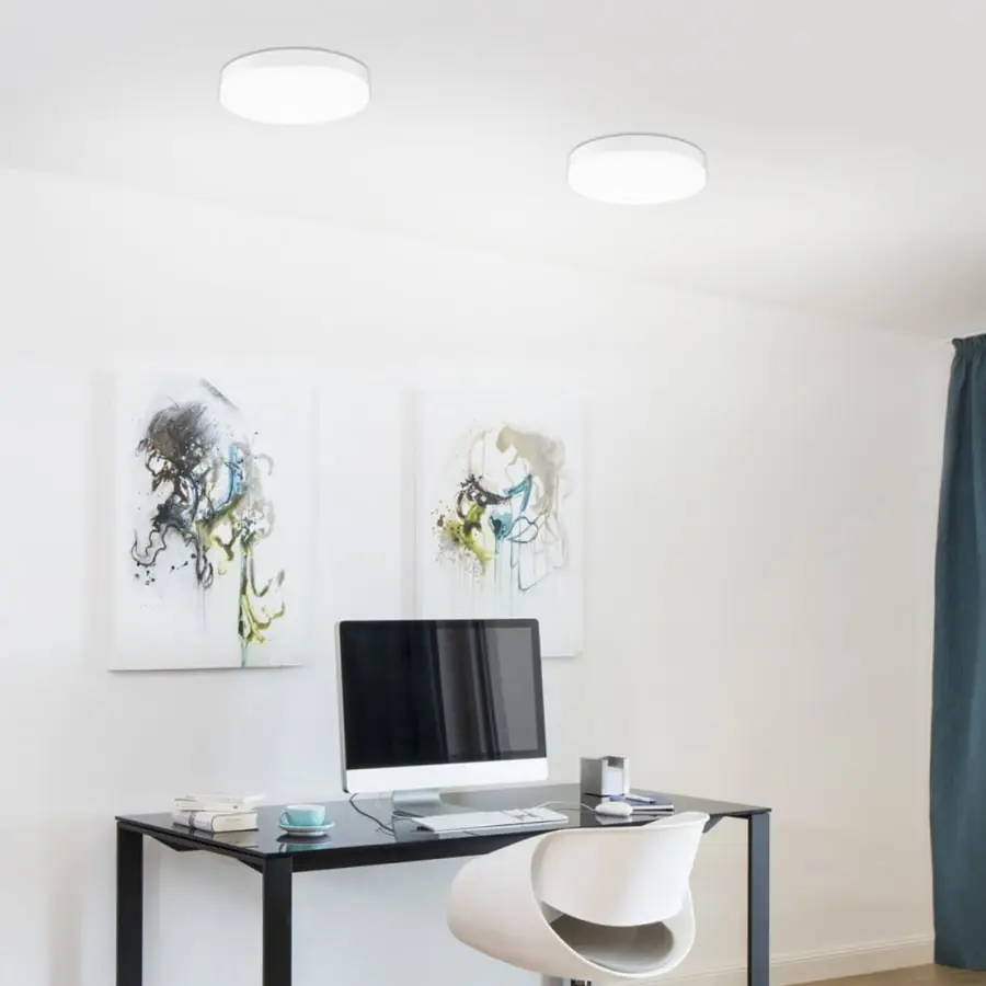 OFFICE LED IP44 is a round, reduced ceiling lamp. The light spreads from behind a smooth, soft white acrylic dome. The lamp contains a 25W LED light source. The reduced design language of the lamp blends into every space and is a safe choice.