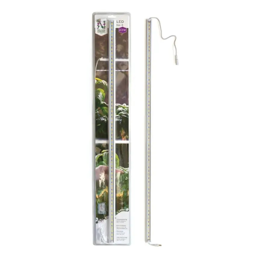 Energiaa säästävä LED-lista ilman muuntajaa. Vain No.1 LED-listaan kytkettäväksi (tuotenro 5567). Sopii esikasvatukseen ja lisävaloksi sisäviljelmille. Pit. 85cm, 23W, 230V, 6400K, nimellinen valovirta 2200 lm, nimellinen palamisaika 35000h, PPFD (100 mm) 141 µmol/s/m².