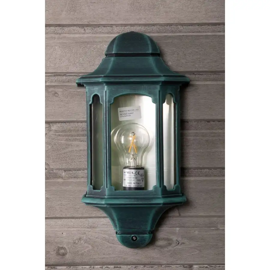 Locket är av klar plast. Lampans grönsvarta ton passar vackert in i den gröna gården.