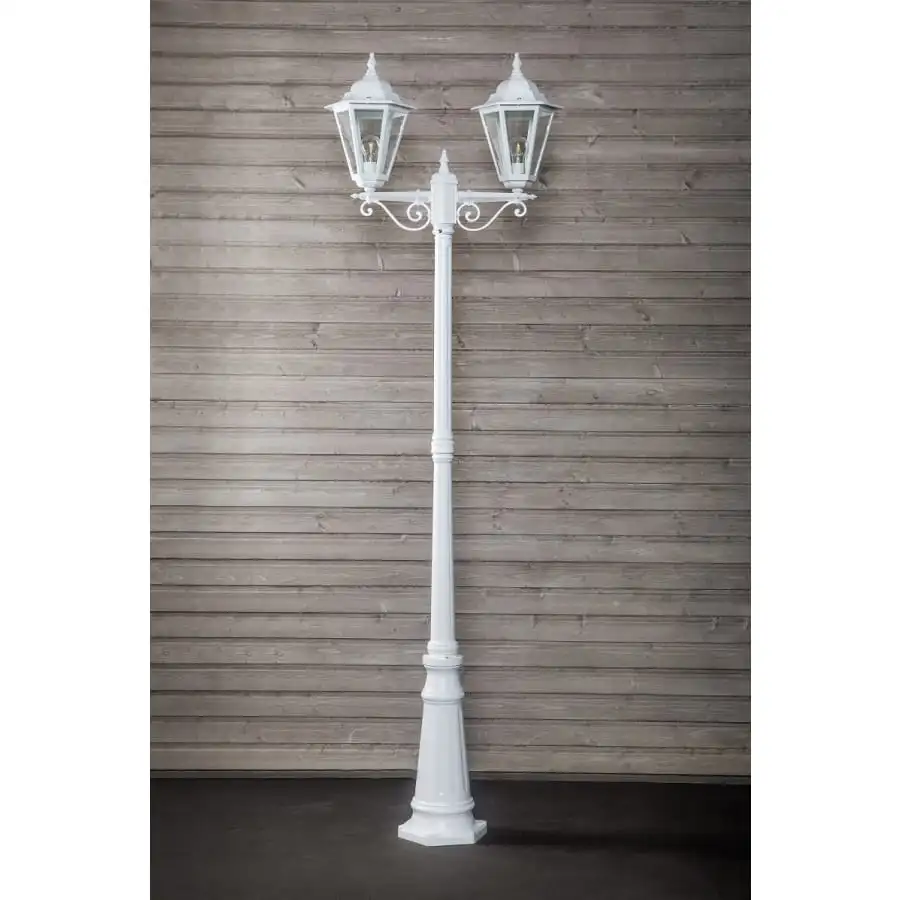 En klassisk 2-delad stolplampa för att lysa upp trädgården och gångvägarna. Den högkvalitativa lampans kropp är gjuten lättmetall, som är avslutad med tre lager färg. I den svarta lampan är glasen rökgrå. I vitt är glasen klara.