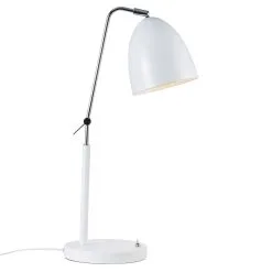 Tidlös bordslampa i blank krom och matt metall. Den övre delen av skaftet är justerbar, och skärmen kan vändas i sidled samt upp och ner.