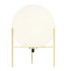 Table lamp with a brass-colored metal base and an opal white glass dome that creates an atmospheric light.
