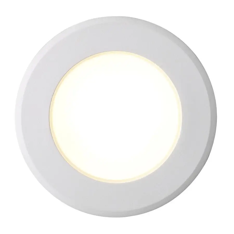 Dimbar downlight av plast, lämplig för utomhus- och inomhusbruk. Downlightens diameter är 9,5 cm. Nedsänkningsdjupet är min. 6 cm och ett nedsänkningshål