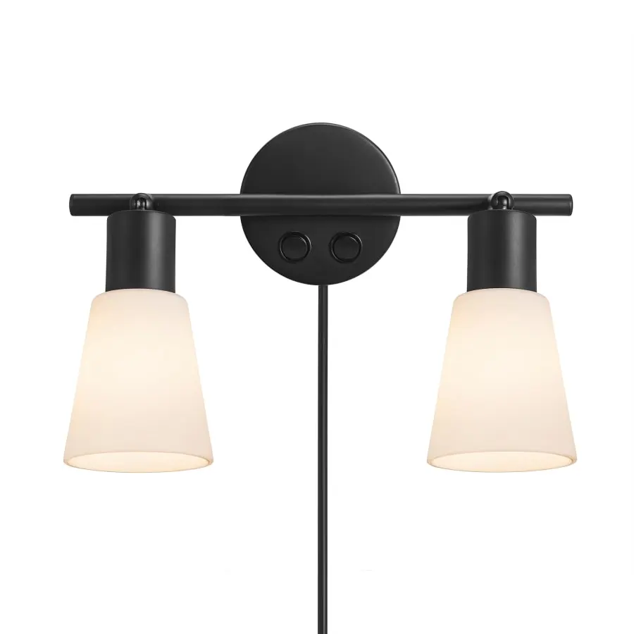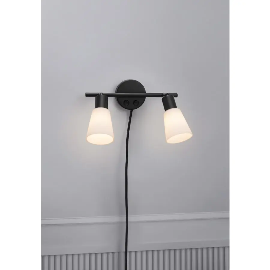 2-delad vägglampa med klassisk design, svart metall och opalvitt glas. Lampans höjd är 17,6 cm, bredd 28,5 cm och djup 21,3 cm. Diametern på skärmarna är 8 cm och höjden är 9 cm. Skärmarna kan lutas upp till 90° och kan även justeras i sidled. Väggpanelen är 9 cm i diameter. Nätsladden är 150 cm lång, och den kan tas loss vid behov, vilket gör att lampan kan installeras permanent. Lampan har två separata strömbrytare.
