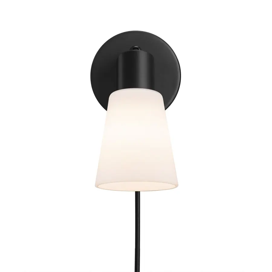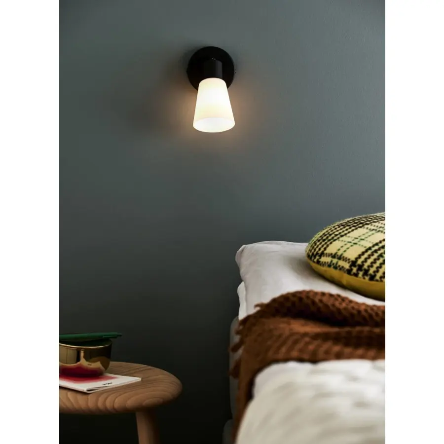 A classically designed wall lamp made of black metal and opal white glass. The height of the lamp is 15.3 cm, width 9 cm and depth 19 cm. The shade has a diameter of 8 cm and a height of 9 cm, and it can be tilted up to 90° and can also be adjusted laterally. The wall panel is 9 cm in diameter. The power cord is 150 cm long, and it can be detached if necessary, allowing the lamp to be permanently installed. The switch is located in the wall plate of the lamp.