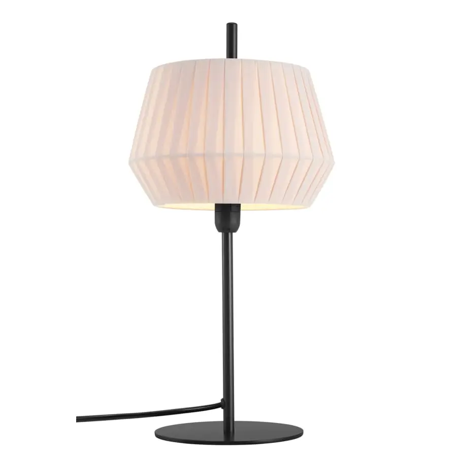 Skuggan av bomullsveke på Dicte bordslampa skapar ett mjukt ljus och en mysig atmosfär. Lampans kropp är av svart metall och dess höjd är 42,5 cm och diametern är 21 cm. Nätsladden är 150 cm lång och har en strömbrytare. Basen är 15 cm i diameter.