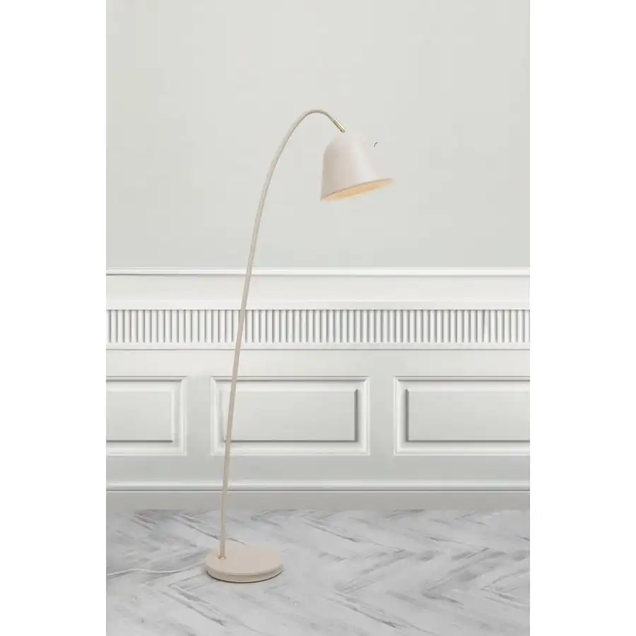 Elegant golvlampa i vintagestil med mässingsbeslag. Lampans höjd är 148 cm, bredd 26,5 cm och djup 61,2 cm. Skärmens diameter är 23,4 cm och diametern på basen är 26,5 cm. Nätsladden är 150 cm lång. Strömbrytaren är placerad ovanpå skuggan.