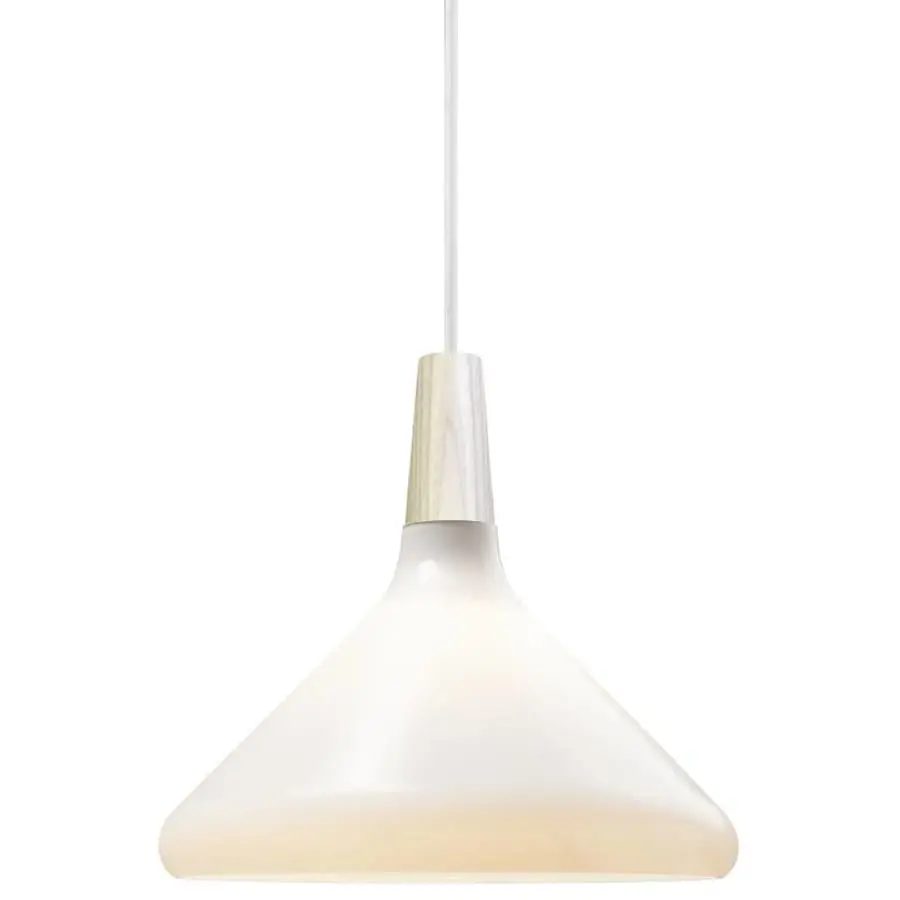 Hanging lamp with an opal white glass shade and an ash wood detail.