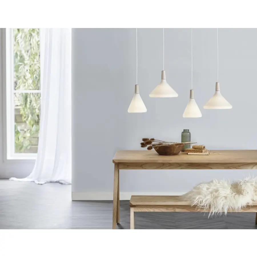Hänglampa med en opalvit glasskärm och en detalj i ask.