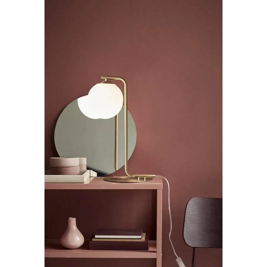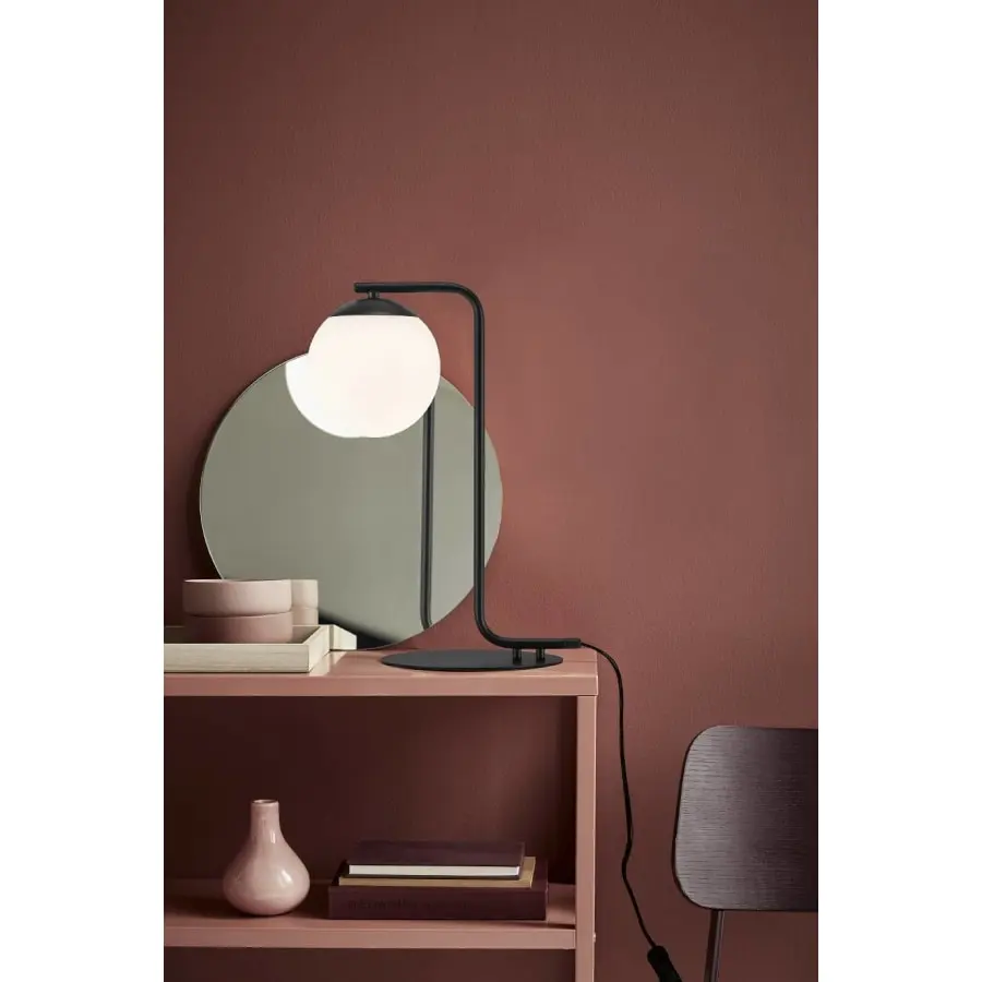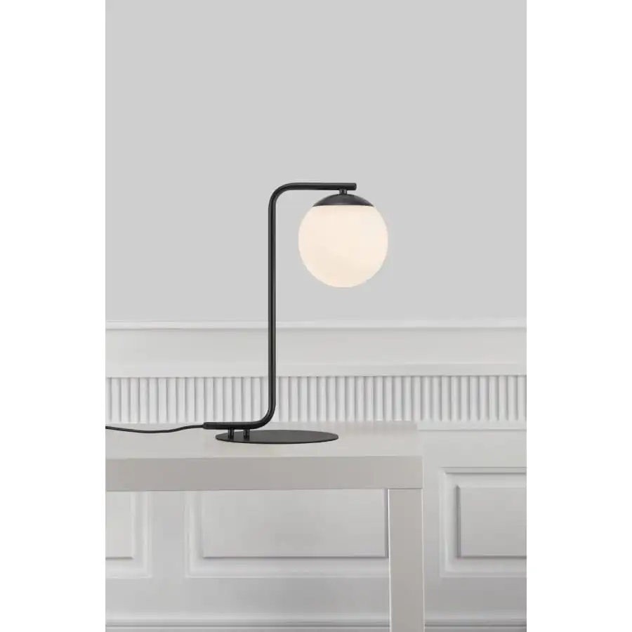 Stylish table lamp with a metal frame and an opal white glass shade.