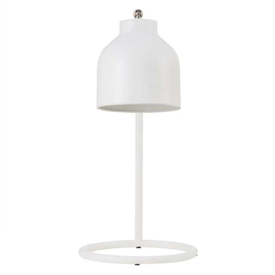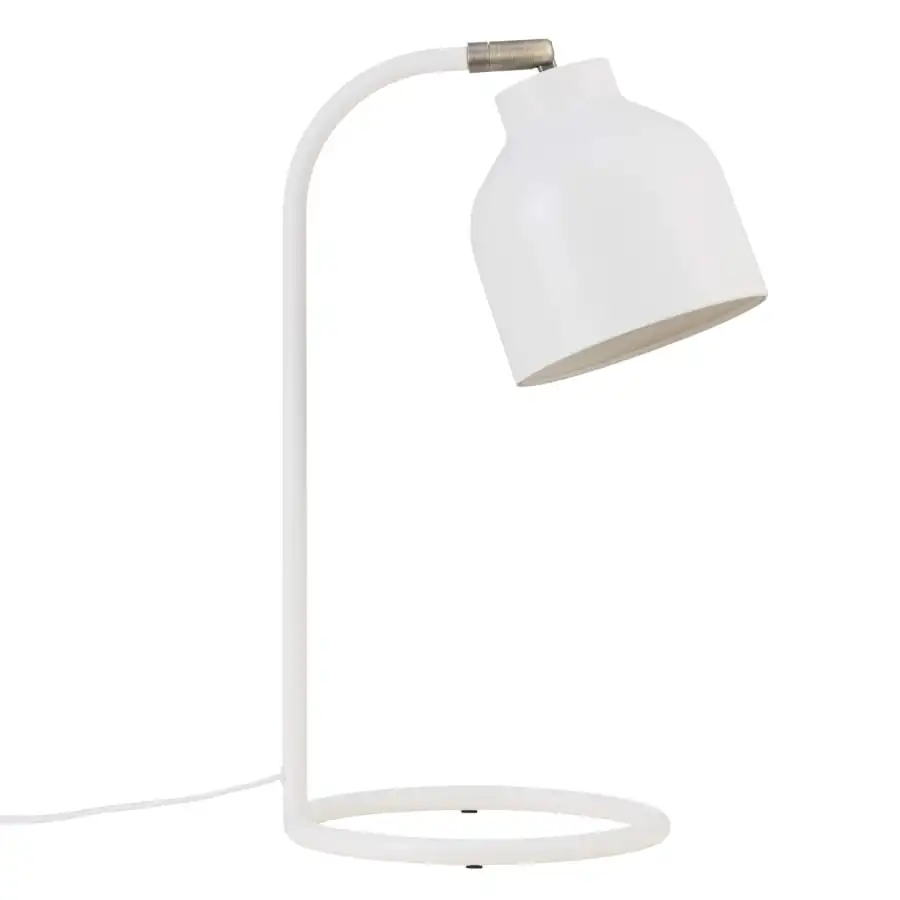 Modern och stilren matt vit bordslampa med mässingsdetaljer. Skärmen kan justeras både i sidled och upp och ner. Det finns små hål i den övre delen av skuggan, varifrån ljuset också lyser uppåt. Lampans höjd är 40 cm och diametern på skärmen är 13 cm. Basen är 19 cm i diameter.