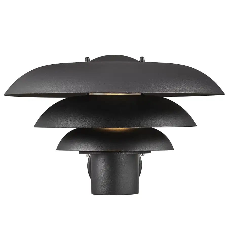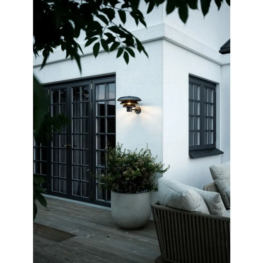 Utomhusvägglampa av stål med kupol i akryl. Lampans höjd är 23,7 cm, bredd 35 cm och djup 38,6 cm. Diametern på väggfästet är 9,8 cm. Lampan kan kedjas.