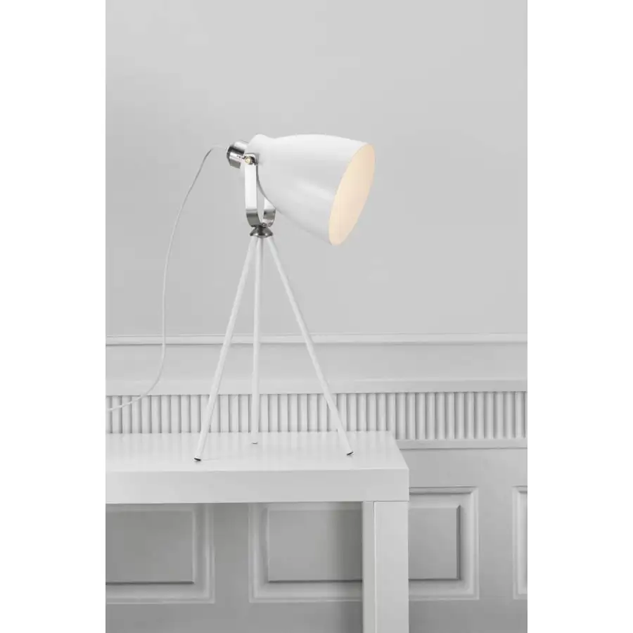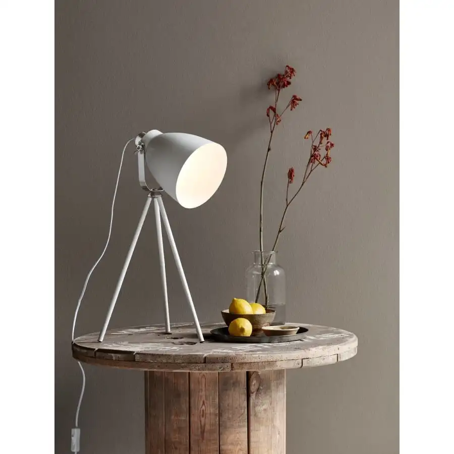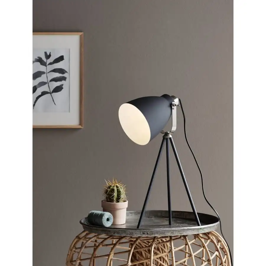 En trebent bordslampa i metall med en höjd på 51,5 cm och en skärmdiameter på 17 cm.
