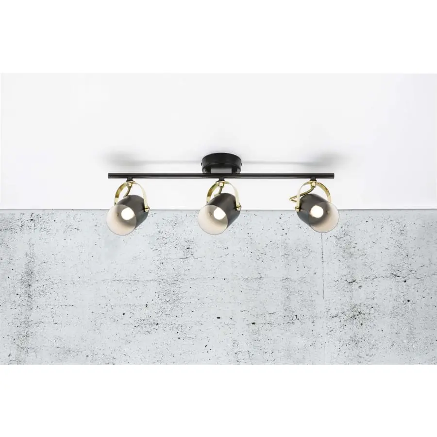 Stylish 3-part spotlight. The width of the lamp is 58 cm and the height is 20 cm. The shades have a diameter of 6.6 cm and are adjustable (150°).