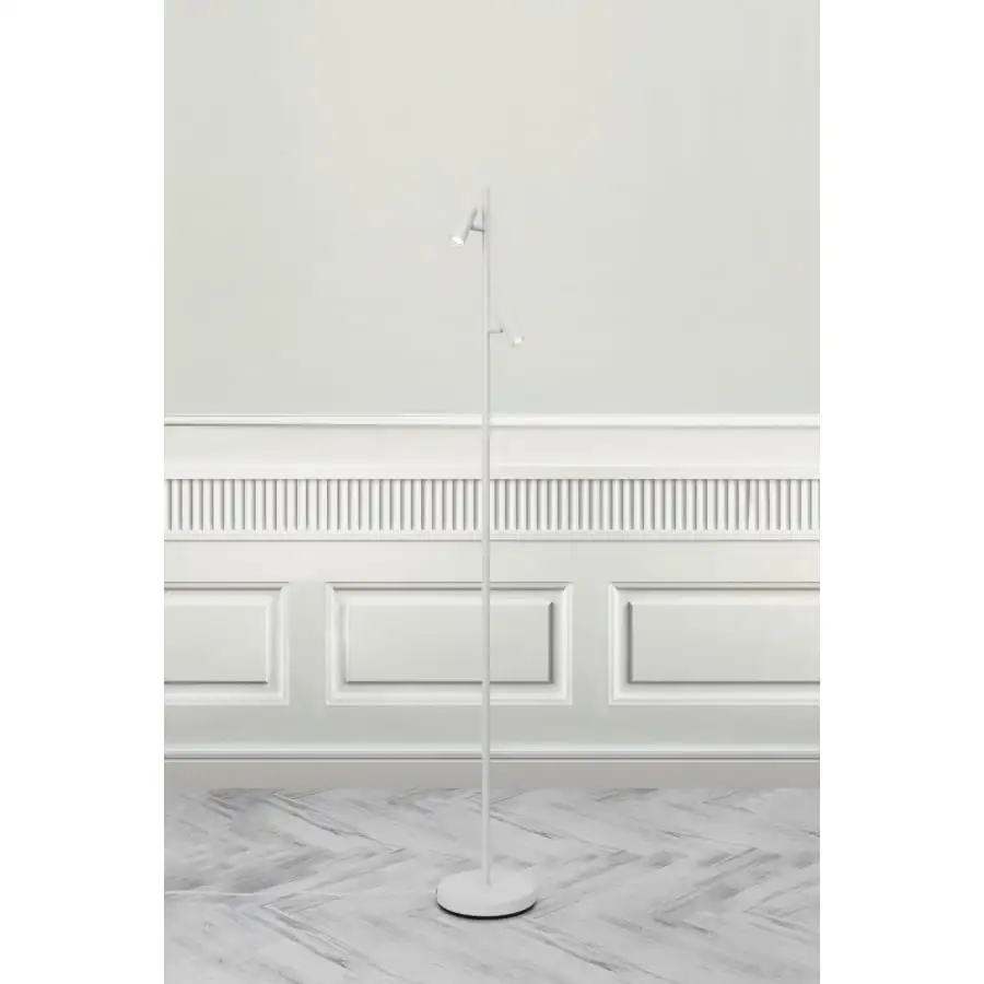 Minimalist two-part LED floor lamp made of metal. The height of the lamp is 141 cm, width 20 cm and depth 20.6 cm. The shades have a diameter of 3 cm and are adjustable. The power cord is 150 cm long. The switch is located in the lamp. The base is 20 cm in diameter.