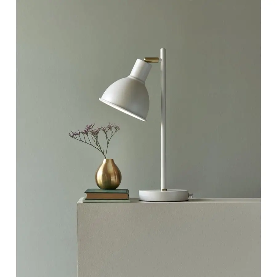 Bordslampa i industriell stil av grov yta av metall och mässing. Lampans höjd är 47 cm och skärmdiametern är 15 cm. Basen är 15 cm i diameter.