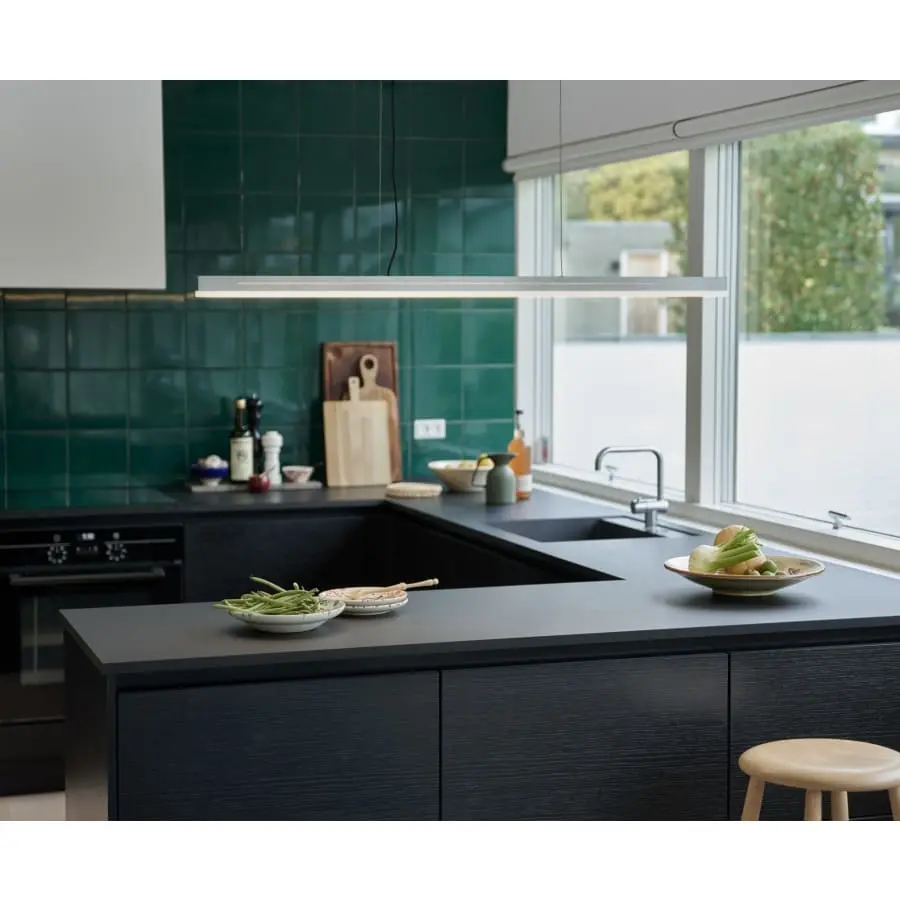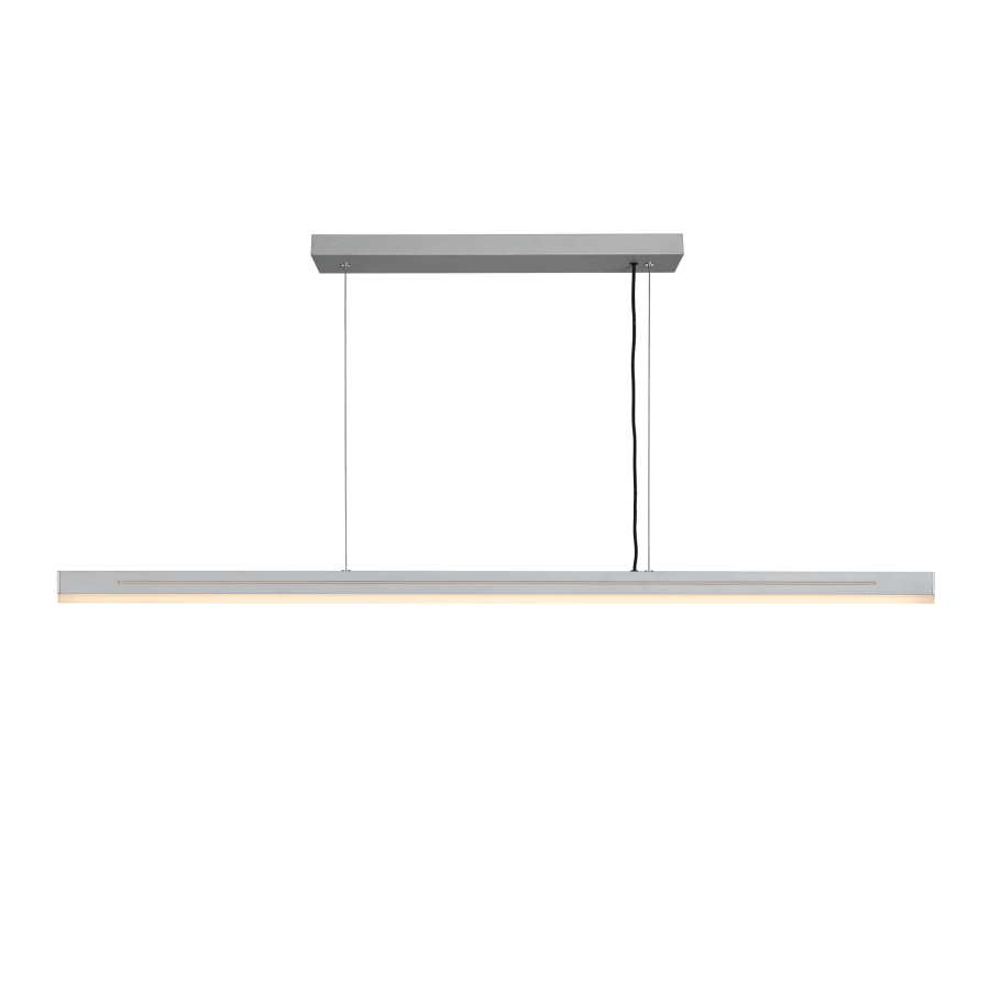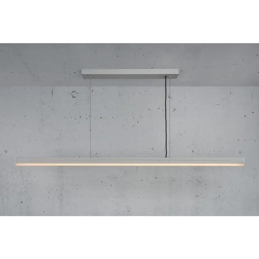 A minimalist, industrial-style LED hanging lamp made of aluminum and plastic. The width of the lamp is 115 cm, height 4.2 cm and depth 3.8 cm. The lamp has a diameter of 23.4 cm and a height of 2.5 cm. The width of the ceiling bracket is 48 cm and the height is 3.1 cm. Fixed installation, sugar block connection. The length of the hanging wire is 205 cm.