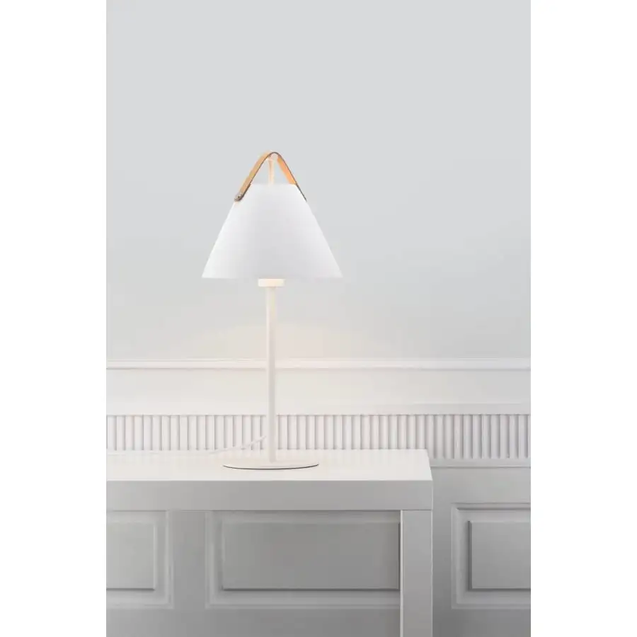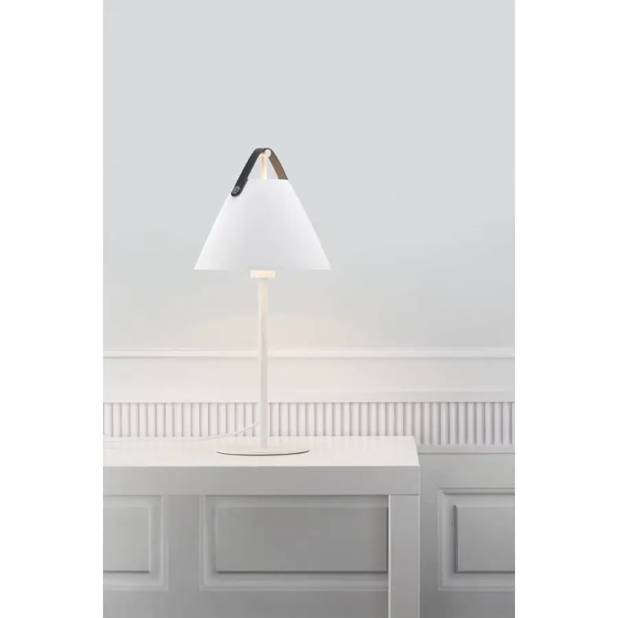 Bordslampan Strap kombinerar metall och läder. Paketet innehåller både ett svart och ett brunt läderband, så att du själv kan påverka det slutliga utseendet på din lampa.