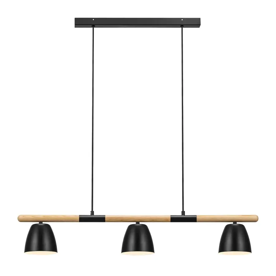 En tredelad hänglampa av metall och trä, som passar till exempel ovanför matbordet. Lampan är 92,6 cm bred, 12,5 cm djup och 16 cm hög. Diametern på skärmarna är 12,5 cm. Nätsladden är 150 cm lång. Strömbrytaren sitter i lampan.