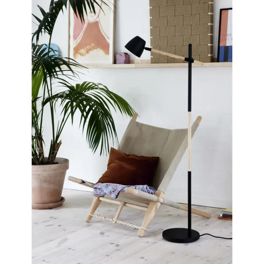 En modern golvlampa som elegant kombinerar två olika material, svart metall och trä. Lampans bredd är 25 cm och djupet är 53,6 cm. Höjden på den raka delen av skaftet är 130,5 cm, den övre delen är justerbar. Skärmen har en diameter på 12,5 cm och är justerbar. Nätsladden är 150 cm lång och har en golvbrytare. Lampans botten är 25 cm i diameter.