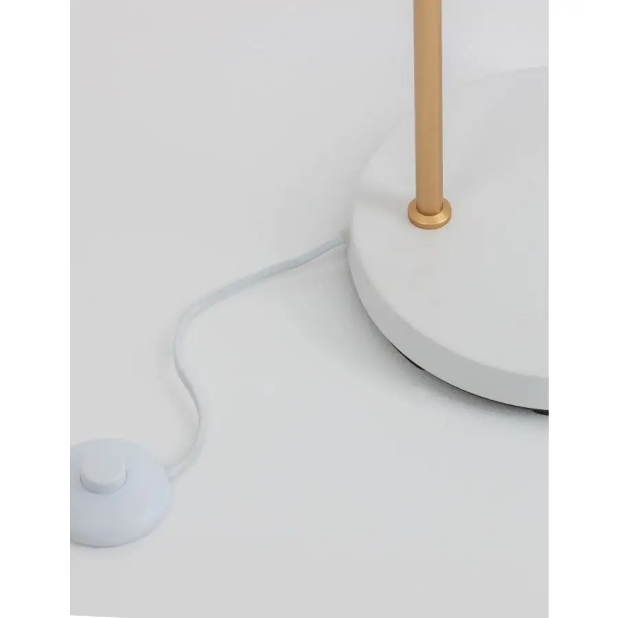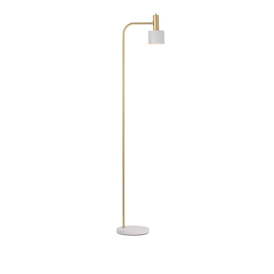 Modern golvlampa med en matt guldfärgad kroppsfärg med en vit kupol. Metalldelarna sitter stadigt på plats och kupolen kan justeras till önskat läge tack vare fogen. Höjden är 165cm och diametern på bottenplattan är 25cm. Det finns en strömbrytare på sladden som du kan använda för att tända och släcka lampan. Lampfoten är E27, glödlampan ingår inte i paketet.