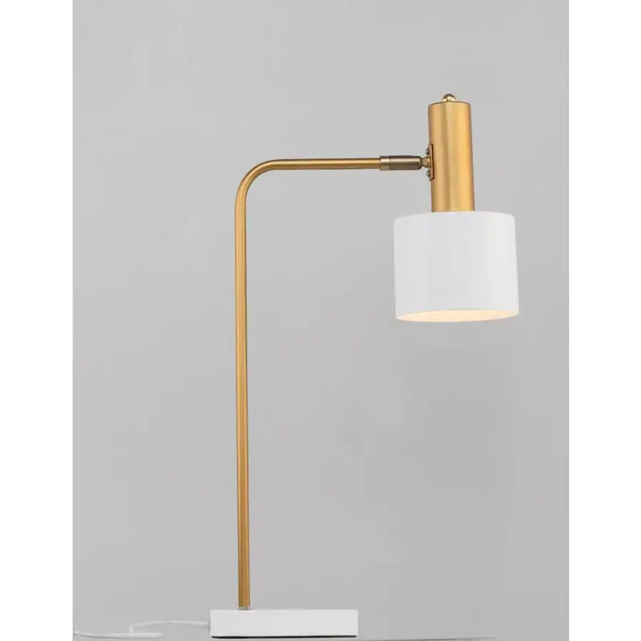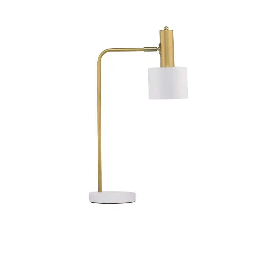 En modern bordslampa med en matt guldfärgad kroppsfärg och en vit kupol. Metalldelarna sitter stadigt på plats och kupolen kan justeras till önskat läge tack vare fogen. Höjden är 60 cm och diametern på bottenplattan är 15 cm. Det finns en strömbrytare på sladden som du kan använda för att tända och släcka lampan. Lampfoten är E27, glödlampan ingår inte i paketet.