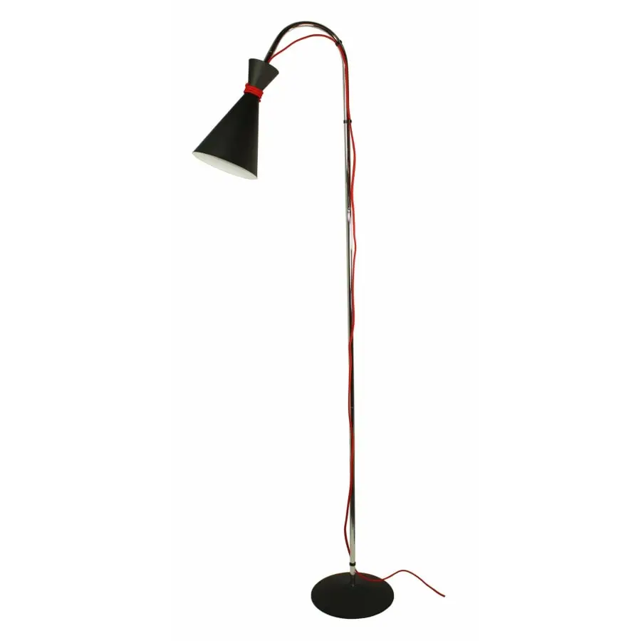 Höjd 165 cm, Djup 25 cm, Bredd 40 cm, Material metall, Färg svart/krom, E27 lampfot Max 60W, IP20, 170 cm röd tygsladd.