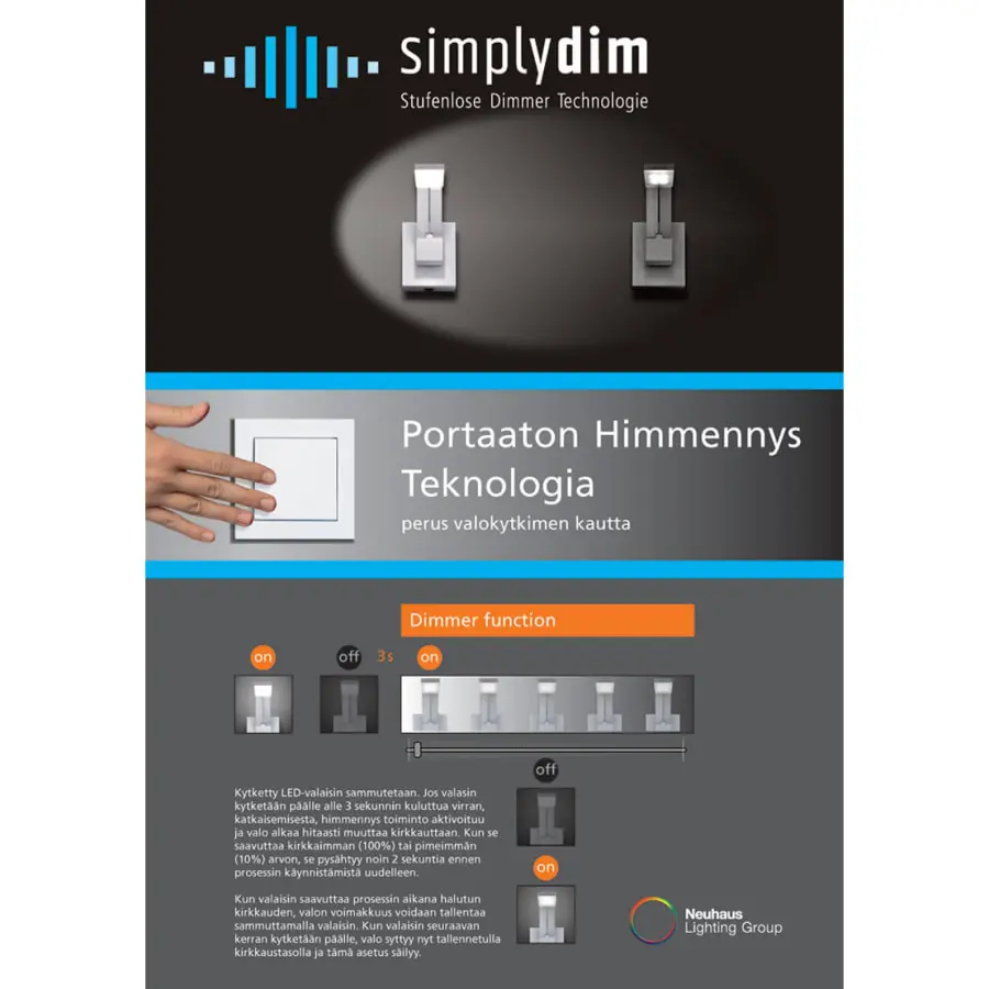 - Other information: With Paul Neuhaus’s new ”Simplydim” technology, the lamp can be dimmed steplessly from 100% to 10%, using a standard wall switch. The connected LED lamp is switched off. If the lamp is switched on less than 3 seconds after turning off the power, the dimming function is activated and the light starts to slowly change its brightness. When it reaches the brightest (100%) or darkest (10%) value, it stops for about 2 seconds before starting the process again. When the lamp reaches the desired brightness during the process, the light intensity can be saved by turning off the lamp. The next time the lamp is switched on, the light will now turn on at the saved brightness level and this setting will be preserved.