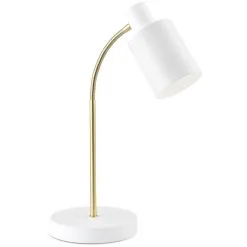 Darcel is a matte white coloured table lamp. The flexible brass arm adds finesse and enables precise direction of the light. Splendid reading light for the bedroom or the office table.