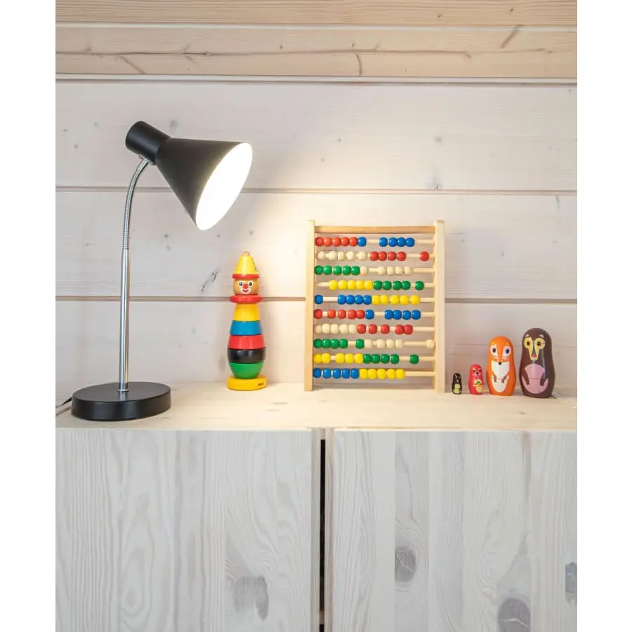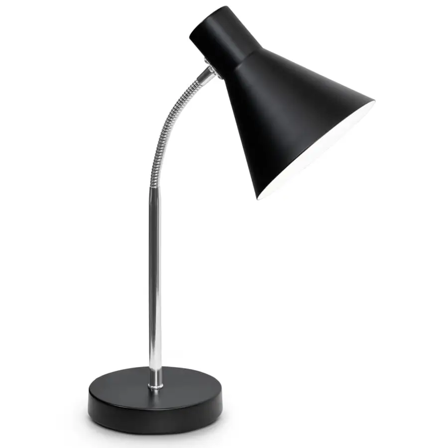 En tidlös bordslampa helt i metall, mattsvart med förkromade detaljer. Det flexibla röret gör det enkelt att rikta ljuset dit du vill. Höjd omkring 42 cm. Har en 1.8 m lång anslutningskabel med avbrytare och flat euro-plug.