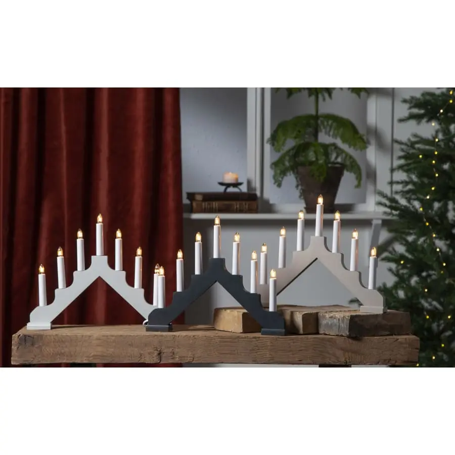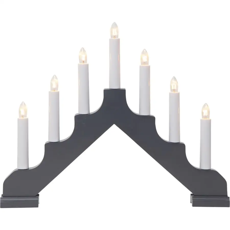 Traditionell 7-grenad elektrisk ljushållare i trä för inomhusbruk. Ljusstaken är 30 cm hög, 37,5 cm bred och 4 cm djup och har 7 utbytbara E10 baslampor.