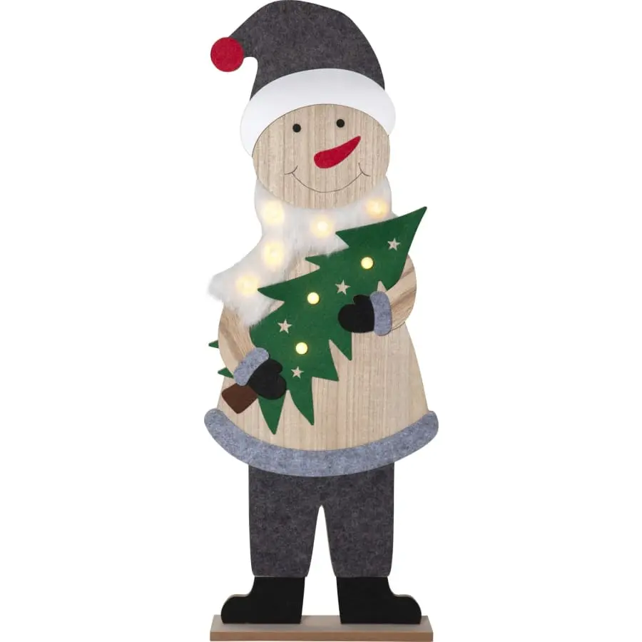 80 cm high, eye-catching snowman decoration for indoor use. The decoration is suitable, for example, for a children’s room, next to the Christmas tree or near the entrance to welcome guests. The snowman is made of MDF board, and the detail is textile decorations. The snowman decoration has 8 fixed LED lamps that create a warm Christmas atmosphere