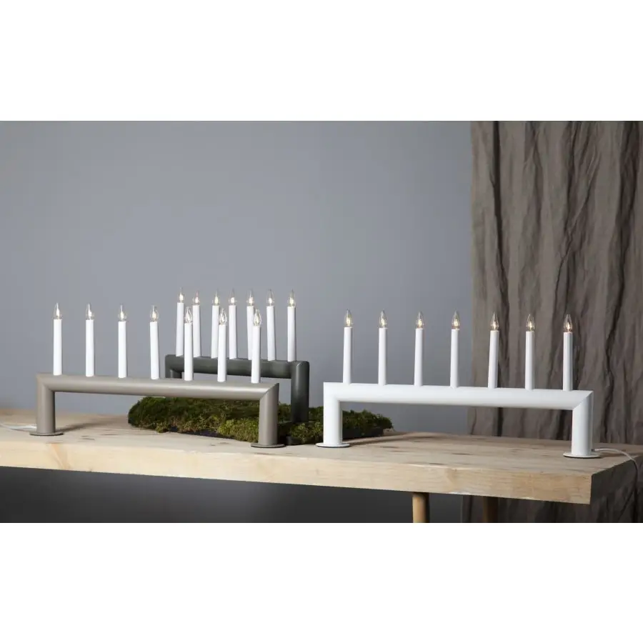 En modern och rak elektrisk ljusstake i trä med en höjd på 29 cm, en bredd på 58 cm och ett djup på 7 cm. Ljusstaken har E10-sockel vackert designade lampor som är utbytbara. Nätsladden utrustad med en strömbrytare är grå/vit till färgen och dess längd är 180 cm.