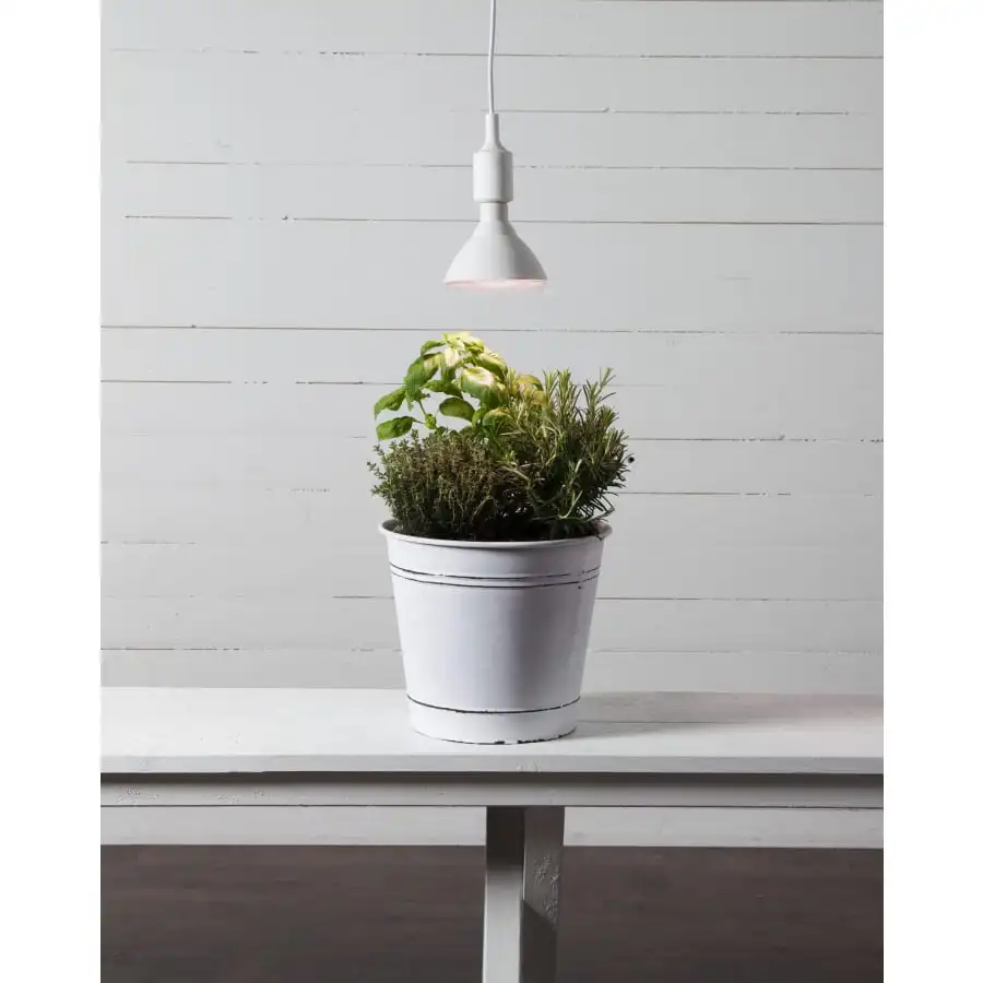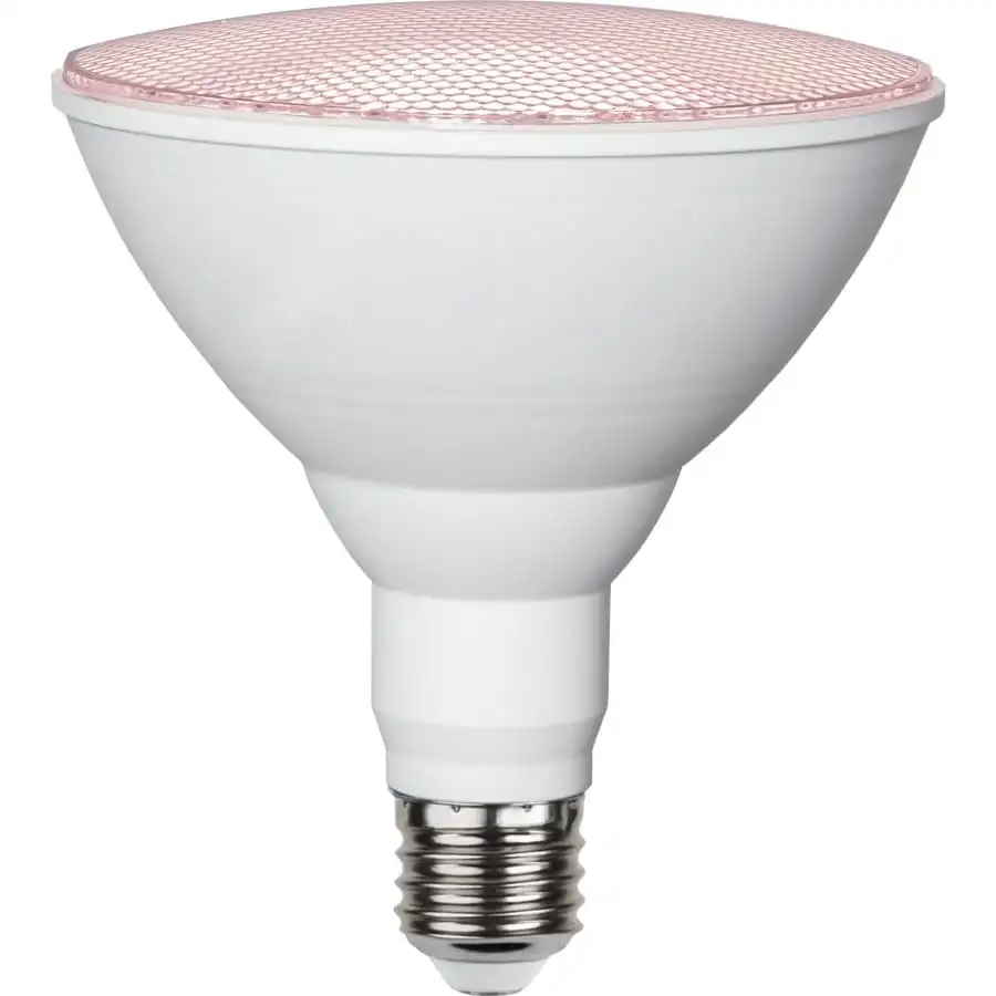Energy-efficient LED plant lamp with E27 base. The lamp produces light with blue and red wavelengths, which accelerate plant growth and increase flowering.