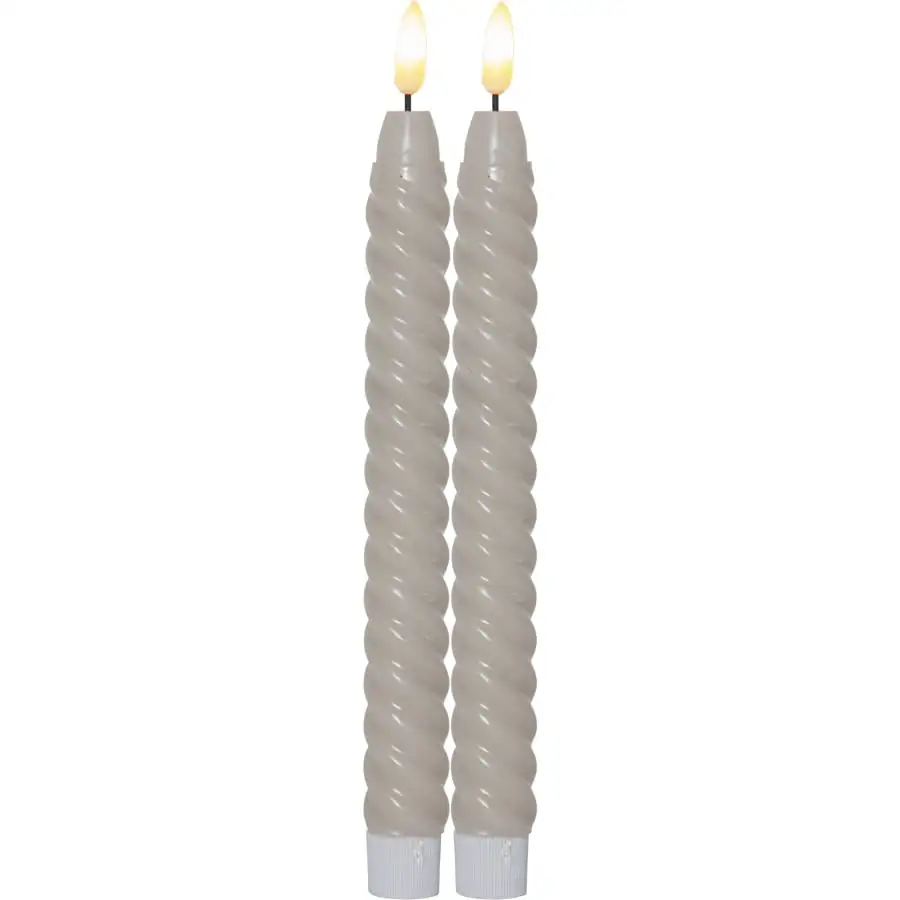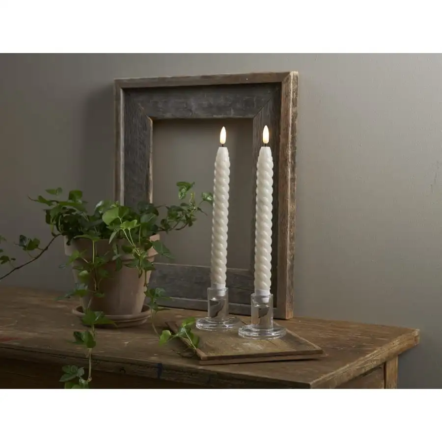 A spiral antique candle made of wax with a real-looking LED flame. The candle illuminates with a warm white light. The package contains two candles suitable for indoor use.
