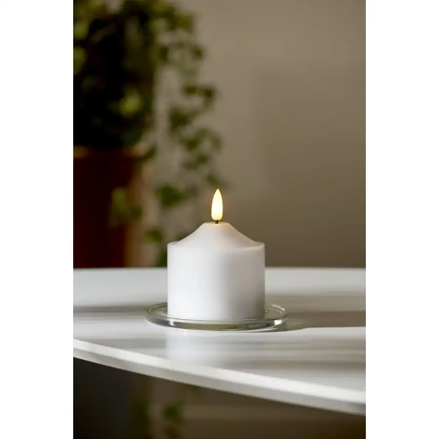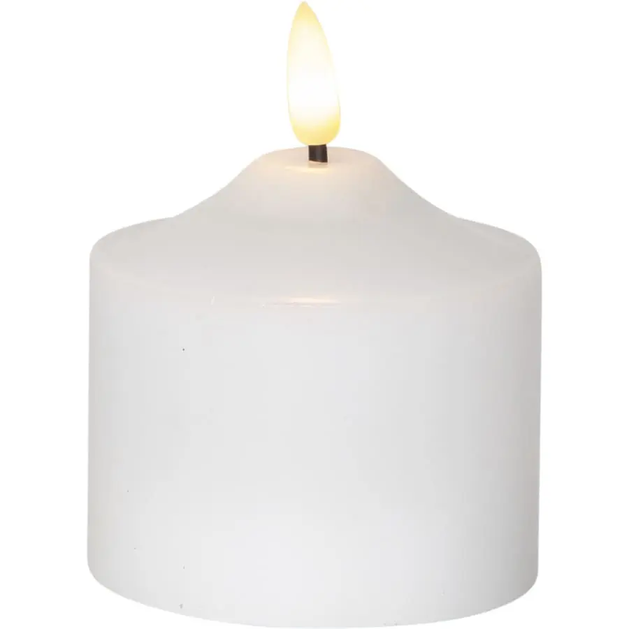 Ett vackert vaxljus med en naturligt utseende varmvit LED-låga. Tre olika storlekar. Höjden på ljuset inklusive lågan är 9,5 cm, 12 cm eller 15 cm och diametern är 7,5 cm. Ljuset är batteridrivet och avsett för inomhusbruk.