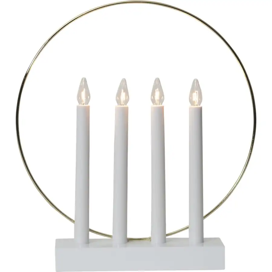 En vacker vit ljusstake med en mässingsfärgad dekorativ ring. För inomhusbruk.