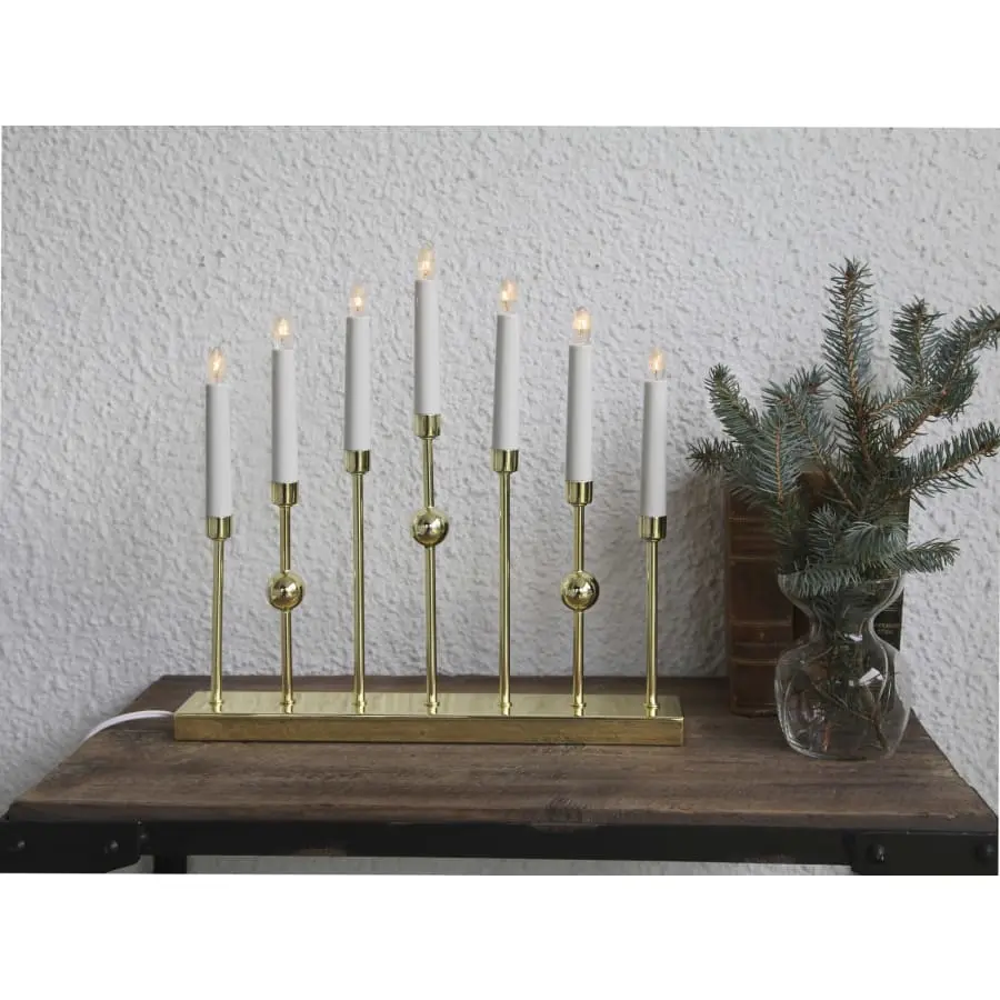 A stylish 7-branched metal candlestick with a height of 37 cm, a width of 37 cm and a depth of 6 cm. The candle has replaceable bulbs with E10 sockets. The power cord with a switch is 180 cm long.
