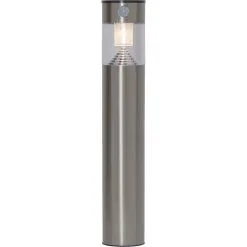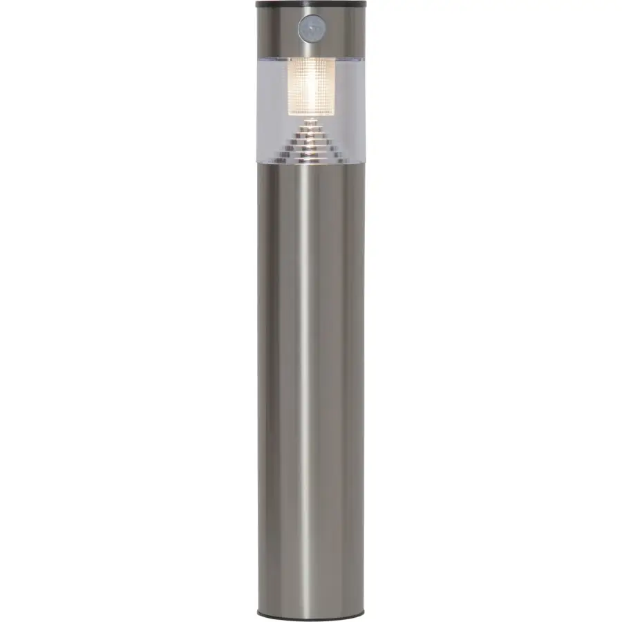 A solar-powered bollard lamp with a motion and twilight sensor. The motion sensor turns on an 80-lumen light for 40 seconds when it detects movement, otherwise the light output is 10 lumens in low light. The operating range of the motion sensor is 5-8 meters and 100 degrees. The lamp has a warm white light.