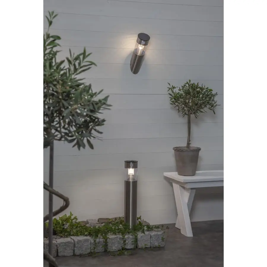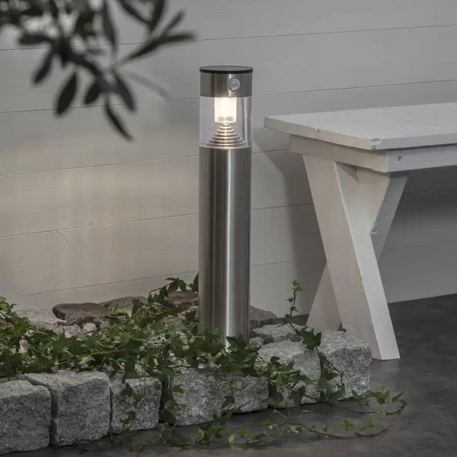 En solcellsdriven pollare med rörelse- och skymningssensor. Rörelsesensorn tänder ett 80-lumen-ljus i 40 sekunder när den känner av rörelse, annars är ljusutbytet 10 lumen i svagt ljus. Räckvidden för rörelsesensorn är 5-8 meter och 100 grader. Lampan har ett varmvitt ljus.