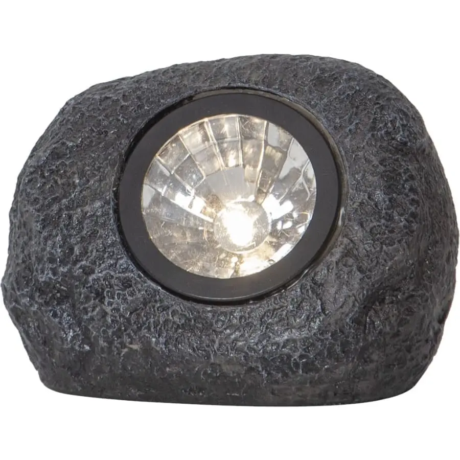 En stenlik spotlight som drivs av en solcell, vars skymningssensor tänder 15 lumen varmt vitt ljus efter skymningen. När den är fulladdad brinner lampan i cirka 6 timmar.
