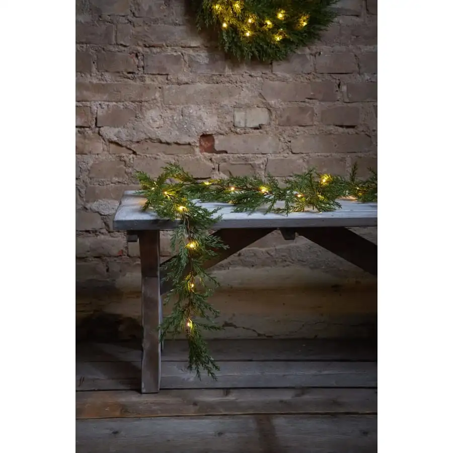 En grön dekorativ vinstock vars grenar liknar Thujaträdets grenar. Stången är upplyst av 20 varmvita LED-lampor.