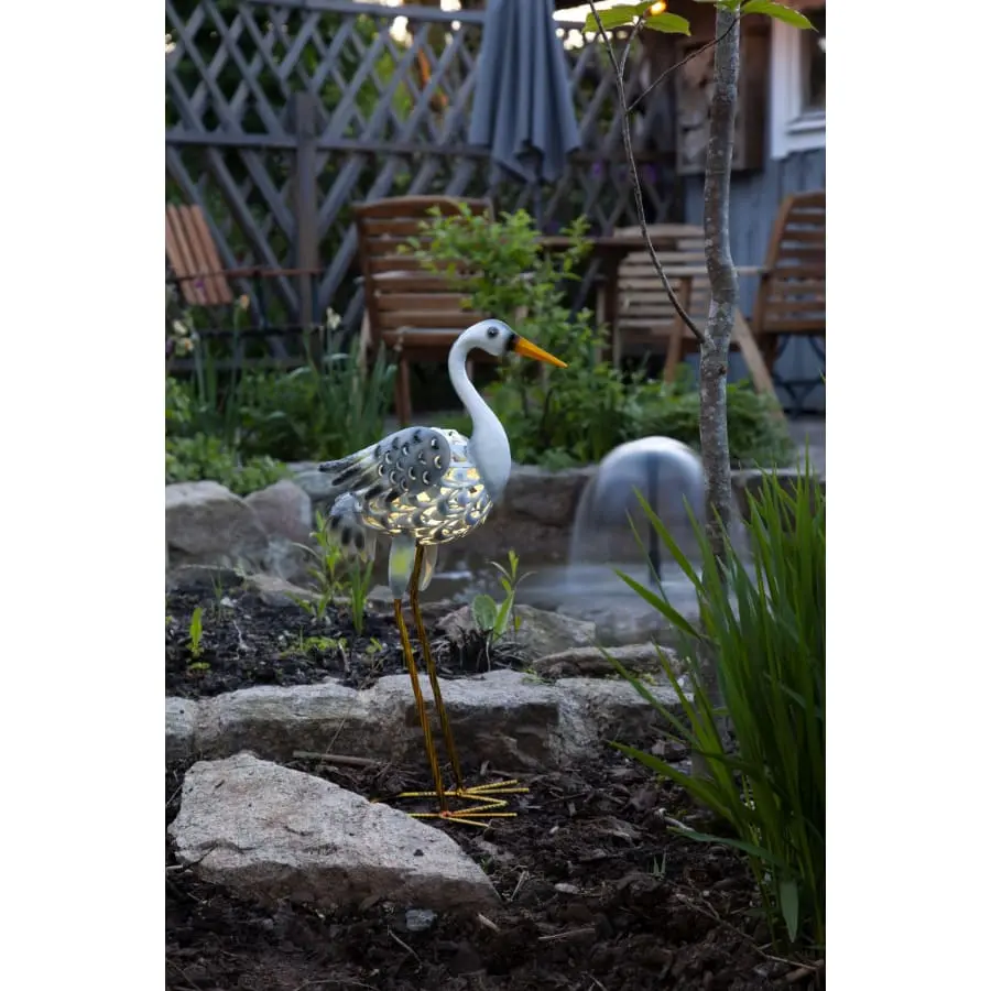 En vacker storkdekoration för trädgården som fungerar med en solcell. Efter skymningen tänds ett varmvitt ljus inuti fågeln. Storken är gjord av metall och plast.