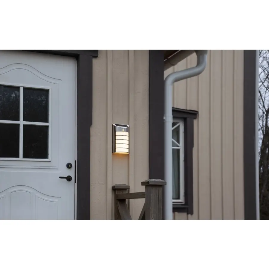 En solcellsdriven vägglampa med rörelse- och skymningssensor. Rörelsesensorn tänder ett 50 lumen ljus i 30 sekunder när rörelse detekteras, annars är ljusuttaget 8 lumen i svagt ljus. Räckvidden för rörelsesensorn är 3-5 meter och 120 grader. Lampan har ett varmvitt ljus.